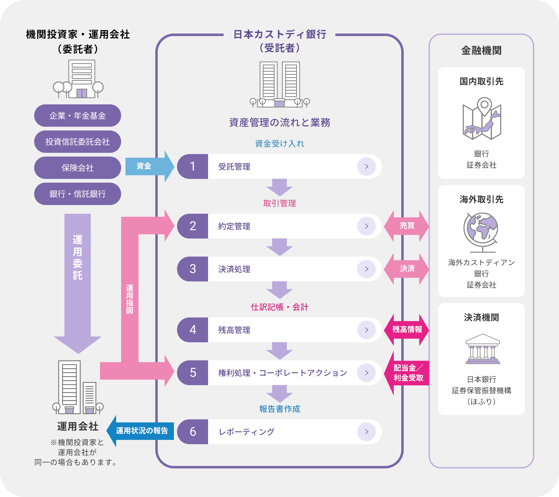 一方、金融市場で資産運用を完結させるためには、数多くの工程と複雑な事務手続きを正確にこなす必要があります。そこで、投資先や金融商品の選定といった資産運用は、機関投資家等が担い、運用資産の管理や事務処理は別の組織が担うという分業の考え方が生まれました。資産管理のプロとして、機関投資家を支える存在、それが私たち日本カストディ銀行です。