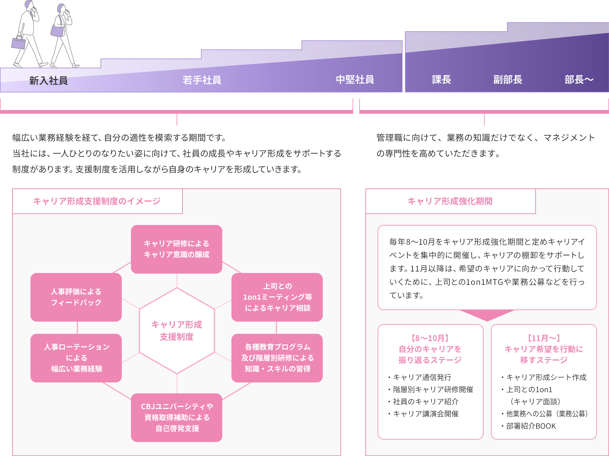キャリア形成支援に力を入れており、自らのキャリアを自らで形成するためにさまざまな施策があります。毎年、業務公募のチャンスを活用して、自分の行きたい部署や学びたい業務に異動する社員もいます。