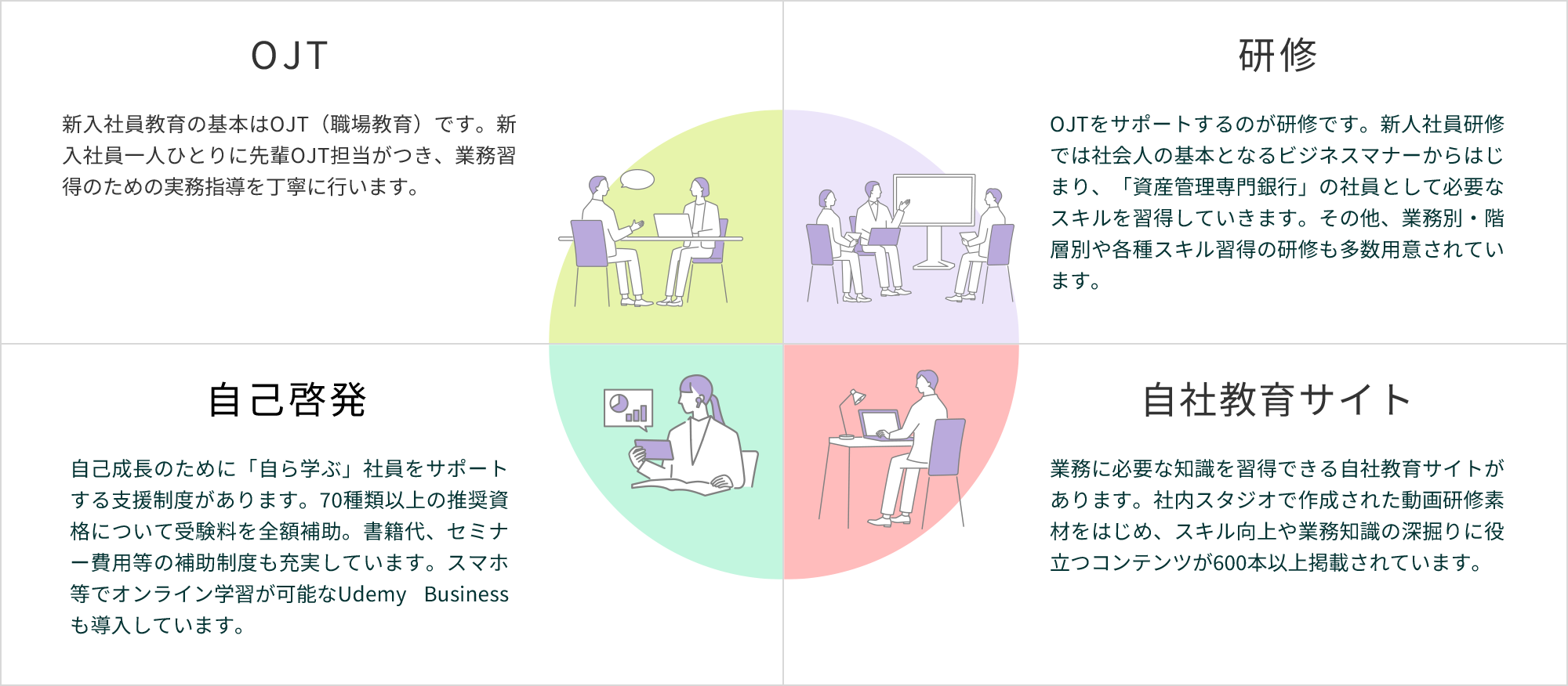 入社から3年間かけて、資産管理専門銀行の社員として活躍するための基礎を学ぶプログラムです。